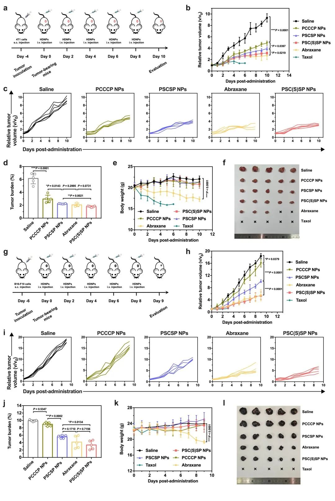 在两种异种瘤移植模型中(图6),与其他两种前药纳米粒和市售的紫杉醇溶液剂Taxol®相比,-SC(S)S-键桥连的前药自组装纳米粒展示出更好的抗肿瘤效果。与市售的紫杉醇白蛋白纳米粒Abraxane®相比,-SC(S)S-键桥连的前药自组装纳米粒具有更高的耐受,有望在更高的剂量下发挥高效的治疗效果。