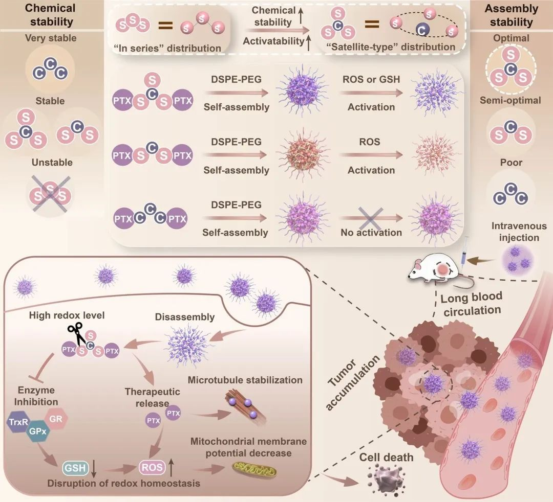 二聚体前药纳米组装体(HDPNs)融合了纳米制剂和前药策略的优点,具备高载药量和低毒副作用等特征,有望突破抗肿瘤纳米药物制剂研发难题,推动抗肿瘤药物治疗领域的科学发展。其主要由连接键将两个药物分子偶联而成的二聚体前药自发组装形成。这一结构突显了连接键在HDPNs中的关键作用,其需要通过合理设计以实现前药的化学稳定性、组装稳定性以及高效的靶部位特异性激活。在前期工作中,该团队发现通过在连接键中“串联”增加硫原子的数量,可以有效提升二聚体前药的自组装能力。此外,连接键中硫原子的数量也会影响其氧化还原响应性。例如,单硫键具有超高的氧化敏感性,但还原敏感性较差。而“串联”三硫键具有超高的还原敏感性,但较弱的氧化敏感性。肿瘤存在异质型的氧化还原微环境,仅能响应单一刺激信号(氧化或还原)的前药制剂难以产生全面、有效的治疗效果。此外,虽然“串联”三硫键可以在一定程度上提高二聚体前药的组装稳定性,但由于硫-硫交换反应的发生,不可避免地限制了前药的化学稳定性。因此,仍需开发新的含硫连接键,以在不削弱其化学稳定性的前提下,进一步提升二聚体前药的组装稳定性和可激活性。