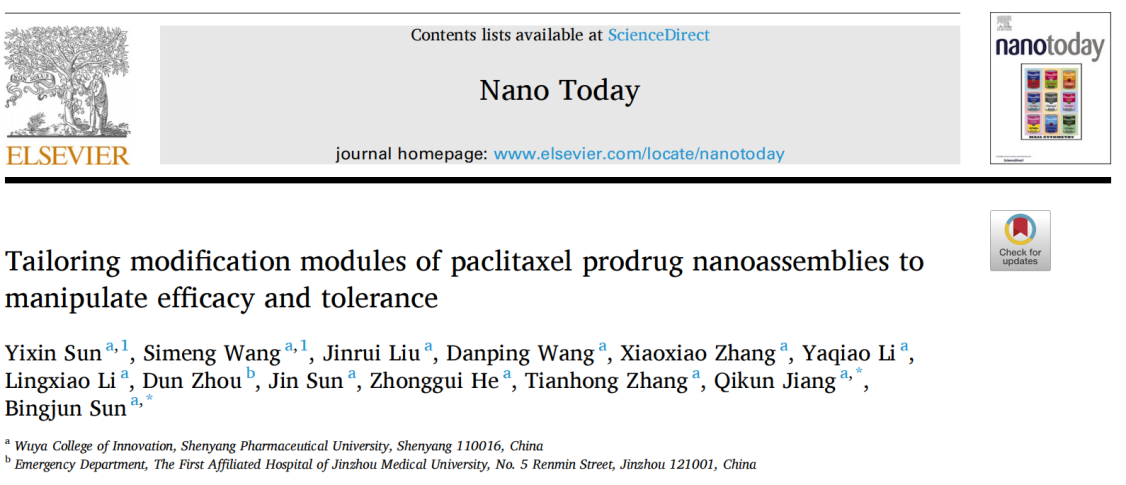 近日,beat365英国官网网站孙丙军教授和姜琪坤特聘教授在Elsevier出版的纳米领域著名期刊《Nano Today》(IF=17.4)上发表题为“Tailoring modification modules of paclitaxel prodrug nanoassemblies to manipulate efficacy and tolerance”的研究性论文,深入探究了不同碳链长度的支链脂肪醇作为修饰模块对前药纳米组装体组装机制、智能激活等方面的影响以及在调控前药纳米组装体药效学和耐受性方面的作用,为小分子前药的合理设计和有效筛选提供参考。beat365英国官网网站孙丙军教授和姜琪坤特聘教授为通讯作者,beat365英国官网网站博士后孙一鑫和硕士毕业生王思梦为本文共同第一作者,本工作得到了张天虹教授的大力支持与指导。