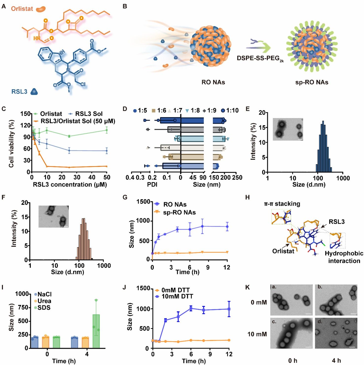 首先,作者验证无细胞毒性的Orlistat增强了RSL3对肿瘤细胞4T1的细胞毒性。采用一步纳米沉淀法,RSL3和Orlistat能够在没有任何载体材料的帮助下,以1:5至1:10的摩尔比进行共组装。综合考虑组装性能和细胞毒性,以RSL3/Orlistat的摩尔比为1:5制备脂质纳米调节器,并在其表面修饰具有氧化还原响应的DSPE-SS-PEG 2K。脂质纳米调节器(sp-RO NAs)具有均一的粒径并在透射电镜下呈现出球形结构。sp-RO NAs在PBS(pH 7.4)、胎牛血清中均具有良好的稳定性。并且,冻干前后,粒径也没有明显变化。随后,利用计算机分子对接技术及作用力破坏实验探讨了驱动RO NAs共组装的分子间作用力。结果表明,上诉共组装过程主要由疏水作用力驱动。此外,为了评估还原刺激引发的sp-RO NAs的解体行为,在二硫苏糖醇(DTT)存在下测定NAs(RO NAs和sp-RO NAs)的粒径变化,并通过透射电镜拍摄到sp-RO NAs经DTT孵育后的形态变化。结果表明,DSPE-SS-PEG2K修饰的sp-RO NAs具有还原反应性,确保其抗肿瘤作用和安全性(图2)。