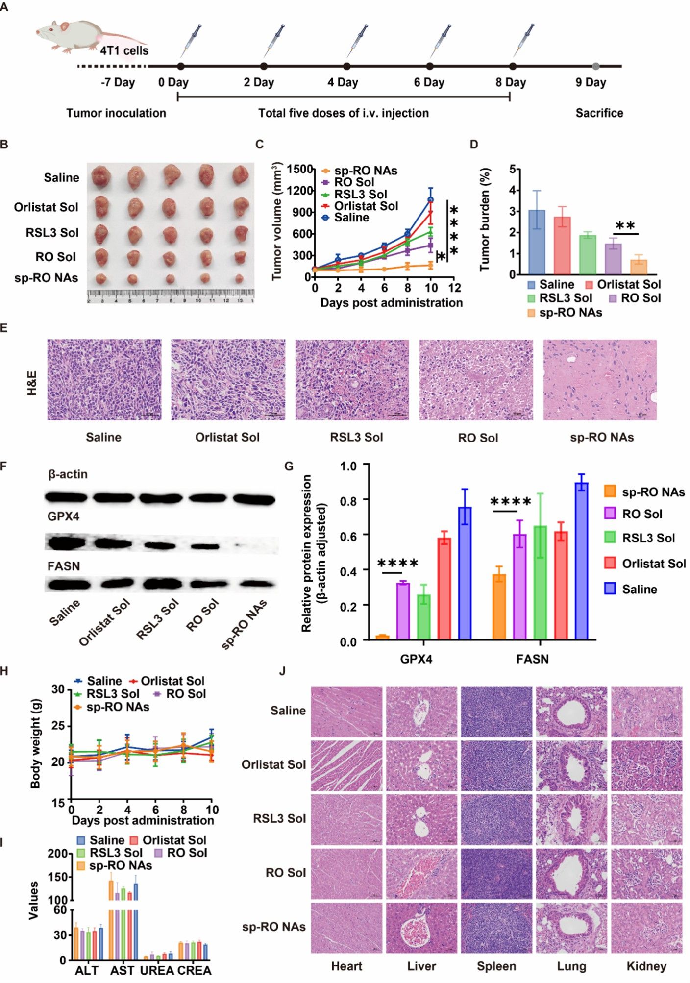 随后,作者通过使用铁死亡抑制剂Fer-1来证明铁死亡的发生。通过western blot实验验证了sp-RO NAs对GPX4和FASN表达的抑制,表明RSL3可以通过抑制GPX4破坏细胞内氧化还原稳态,导致细胞内ROS的积累,最终引发铁死亡。同时,Orlistat可以通过抑制FASN提高脂膜不饱和程度,从而提高细胞对ROS的敏感性。之后,作者检测了4T1细胞内氧化还原的水平,评估不同制剂诱导铁死亡的能力。结果显示经sp-RO NAs处理后的4T1细胞,胞内ROS、LPOs和MDA水平显著增高。这些结果证明,Orlistat确实能增强4T1细胞对RSL3诱导的铁死亡的敏感性(图4)。