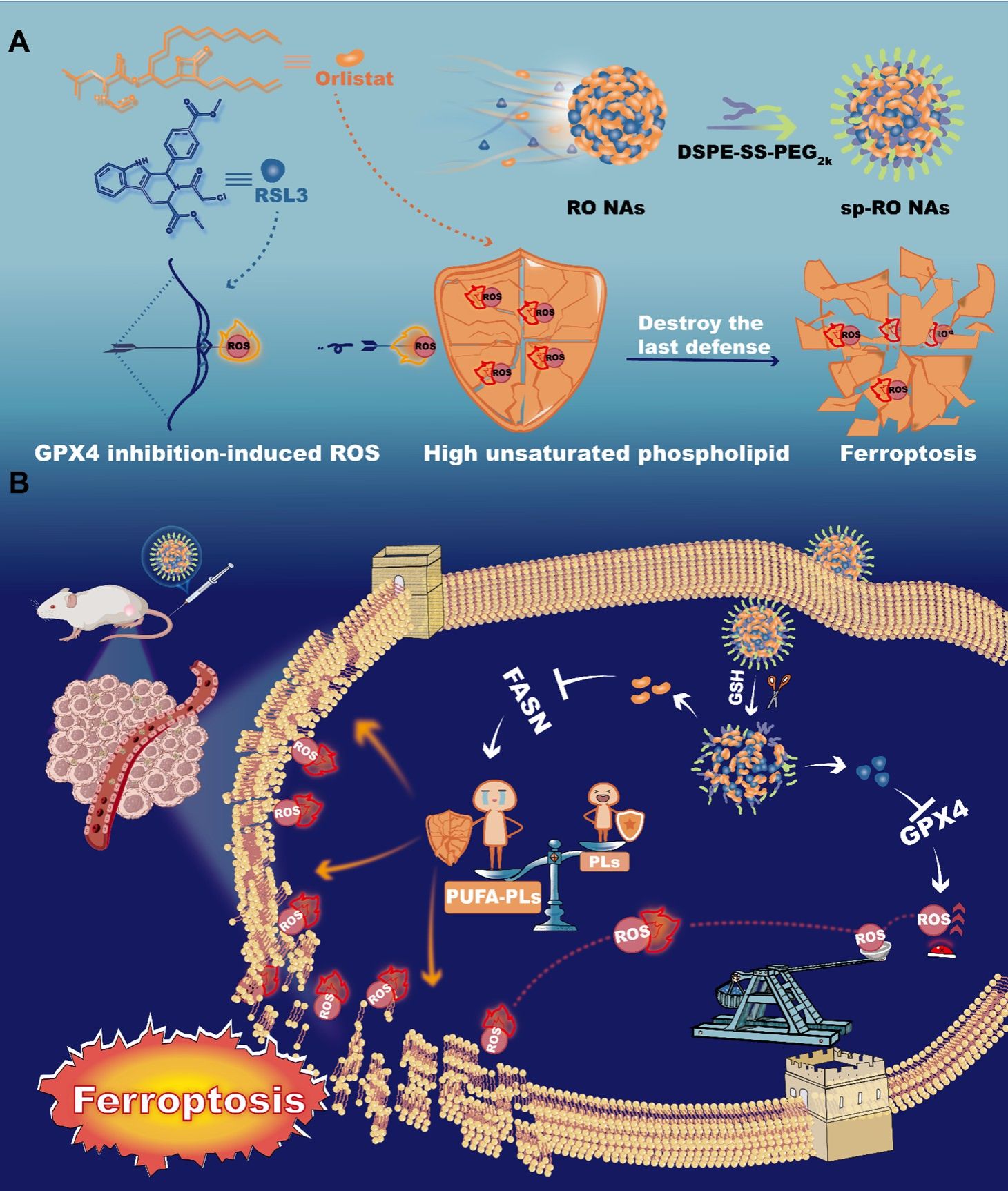 在这项研究中,作者提出了一种创新策略,旨在通过拆除铁死亡过程中的“最后一道防线(膜脂质屏障)”来放大铁死亡驱动的抗肿瘤作用。作者通过纳米组装技术和分子工程设计,构建了GPX4抑制剂(RSL3)和FASN抑制剂(Orlistat)的二元脂质纳米调节器(图1)。在组装过程中,RSL3和Orlistat可以自发组装成均匀的纳米组装体(RO NAs),进一步使用还原响应DSPE-SS-PEG 2K对RO NAs进行修饰,增强了纳米粒的稳定性并实现肿瘤特异性药物释放。值得注意的是,Orlistat本身是一个无细胞毒性的小分子化合物,通过抑制 FASN 来调节细胞膜脂质组成,促进多不饱和脂肪酸(PUFAs)的合成和积累。实验结果表明,与单独使用RSL3相比,无细胞毒性的Orlistat显著增强了 RSL3 对肿瘤细胞的细胞毒性,引发了强烈的铁死亡。最终,纳米调节器通过Orlistat和 RSL3 的联合诱导引发了剧烈的脂质过氧化风暴,成功瓦解了对抗铁死亡的“最后一道防线”,在 4T1 肿瘤小鼠中显示出良好的治疗效果。这项研究为开发铁死亡驱动的抗肿瘤纳米疗法提供了一个有效的范例,展示了分子工程在推进癌症治疗方式方面的潜力。