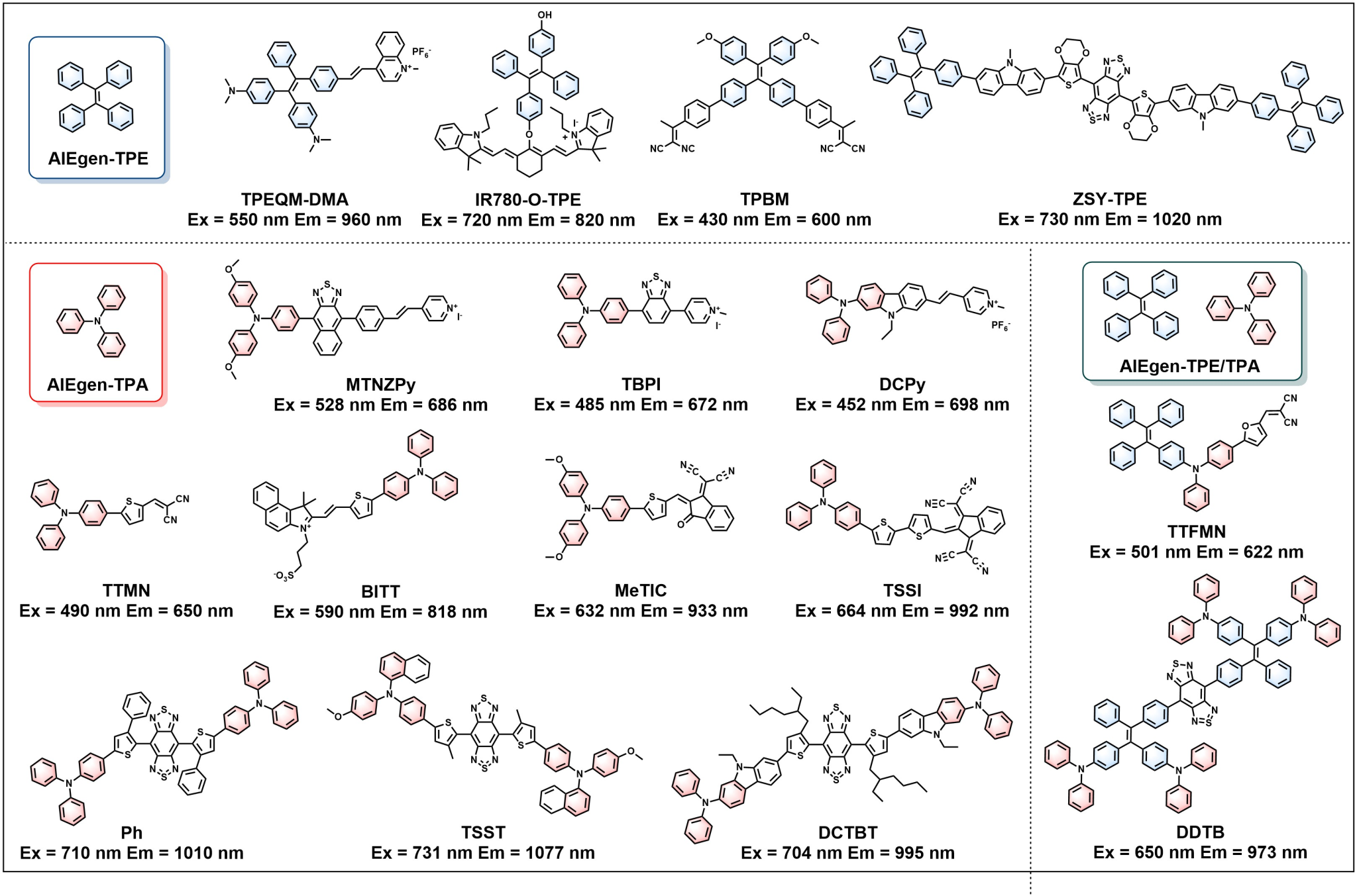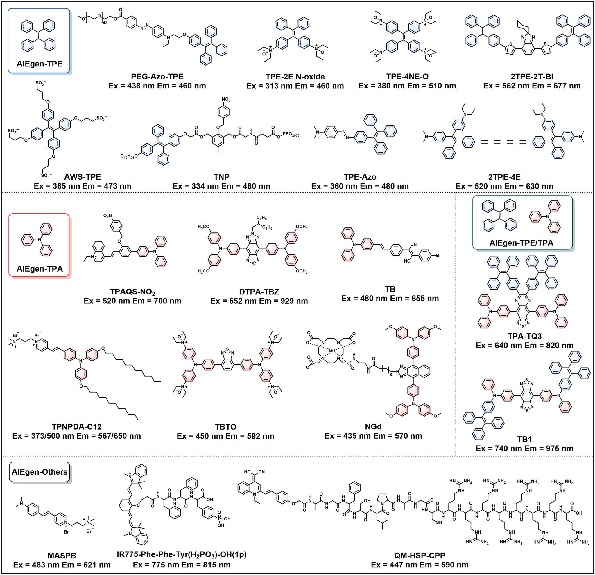 PEG-Azo-TPE、TPE-Azo、AWS-TPE、TPAQS-NO2、TNP、TPE-2E N-oxide、TPE-4NE-O和QM-HSP-CPP是肿瘤微环境响应的荧光成像AIE纳米探针;MASPB和TPNPDA-C12是细胞器靶向的荧光成像AIE纳米探针;2TPE-4E和2TPE-2T-BI是生物正交的荧光成像AIE纳米探针;IR775-Phe-Phe-Tyr(H2PO3)-OH和TPA-TQ3是光声成像AIE纳米探针;TB1、DTPA-TBZ和TBTO是兼具荧光和光声成像的AIE纳米探针;TB和NGd是兼具荧光和磁共振成像的AIE纳米探针。