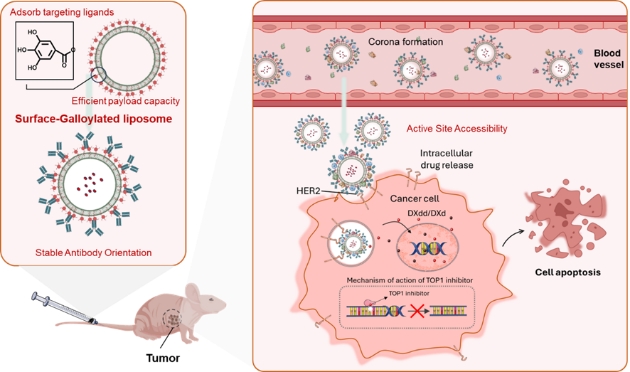 在肿瘤治疗和精准药物递送领域,靶向纳米载体因其高选择性和疗效潜力而备受期待。然而,蛋白冠效应会掩盖表面修饰的配体,导致靶向性丧失;同时,传统的抗体化学偶联工艺复杂,存在免疫原性风险和产业化障碍。这些瓶颈长期阻碍了主动靶向纳米药物的临床转化。近日,beat365英国官网网站王永军教授团队在Nature Communications发表研究成果,报道了一种基于没食子酰基修饰脂质的表面没食子酰基化脂质体(Galloylated liposomes, GA-lipo)。该体系通过非共价方式稳定吸附抗体,实现抗体Fab端定向暴露,且不受蛋白冠遮蔽影响,在动物模型中验证了该策略的高效靶向递送和显著抗肿瘤疗效。