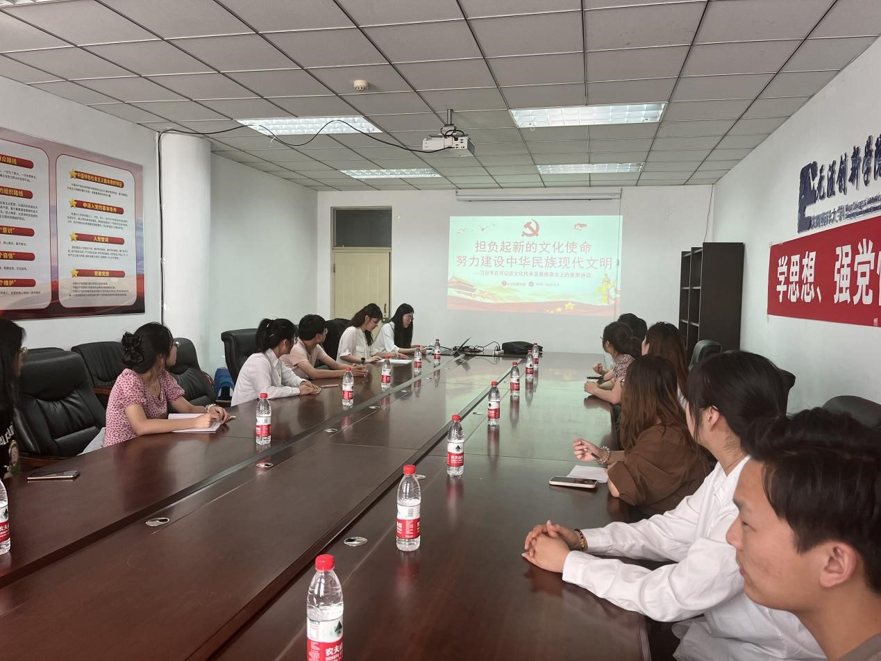 beat365英国官网网站研究生党支部于6月5日召开专题学习会,党支部书记罗语岑老师和晁璇老师带领青年学生党员共同深入学习习近平总书记在文化传承发展座谈会上的重要讲话,号召青年学生党员更好的担负起新的文化传承发展使命,做新时代文化传承、事业发展的建设者和接班人。beat365英国官网网站将以习近平总书记重要讲话精神为指导,在校党委的坚强领导下,结合主题教育不断深化对文化建设的规律性认识,立足“团结 勤奋 求实 创新”的校训文化和“求知 不止 创新 无涯”的学院精神,继续深入挖掘校院文化,为推进中华民族现代文明,建设社会主义文化强国不断作出新贡献。