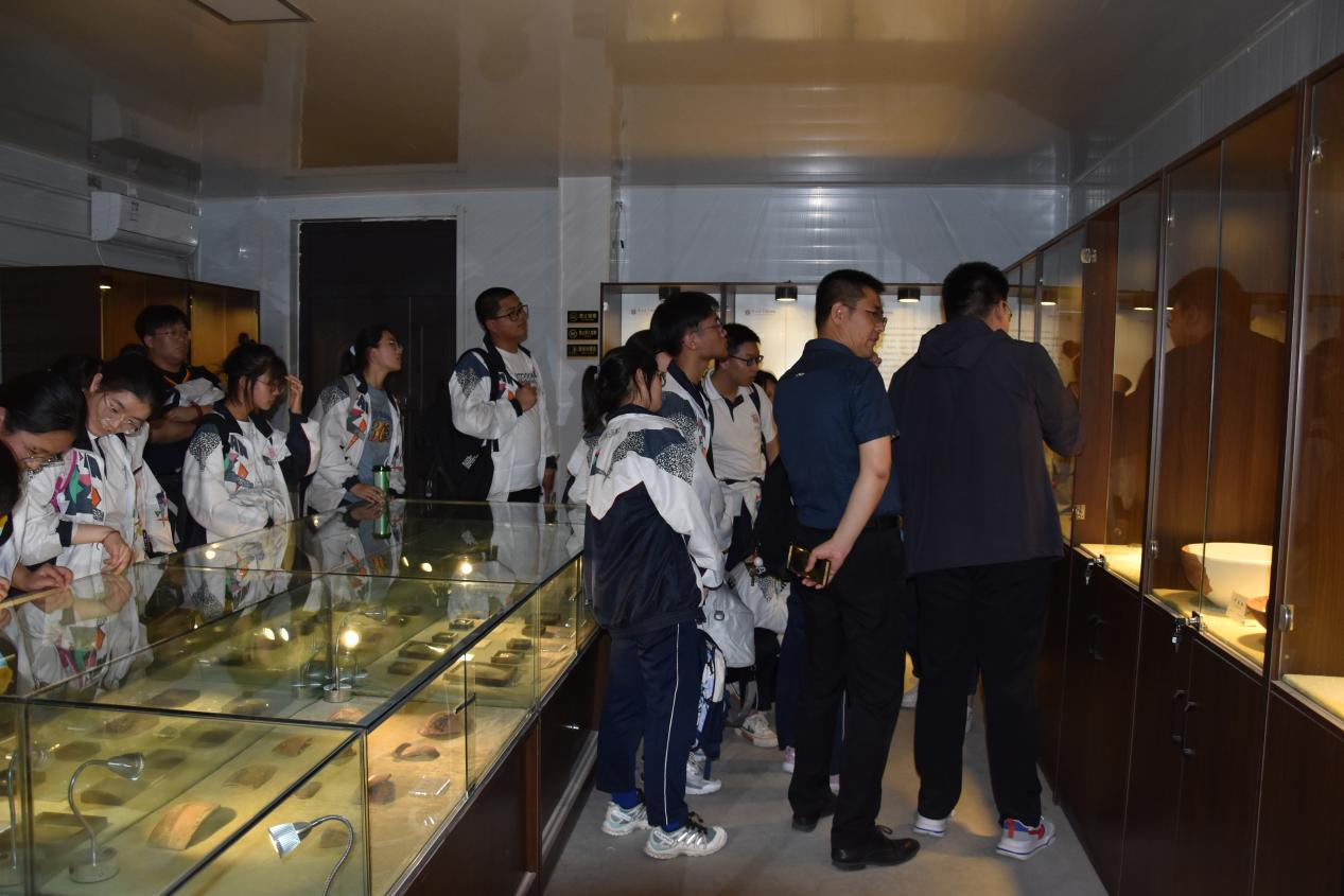 同学们轮流参观陈列室,通过研究生对发掘出土的遗物进行的详细讲解,对师村遗址的重要意义有了初步认识,明白了考古学是一门“透物见人”的学科。夏县师村遗址是晋南内涵最丰富的仰韶早期聚落遗址,揭示了黄河流域最早的夯土,填补了仰韶时代早期的空白,发现了中国最早的石雕蚕蛹,成为中华文化的重要标识。