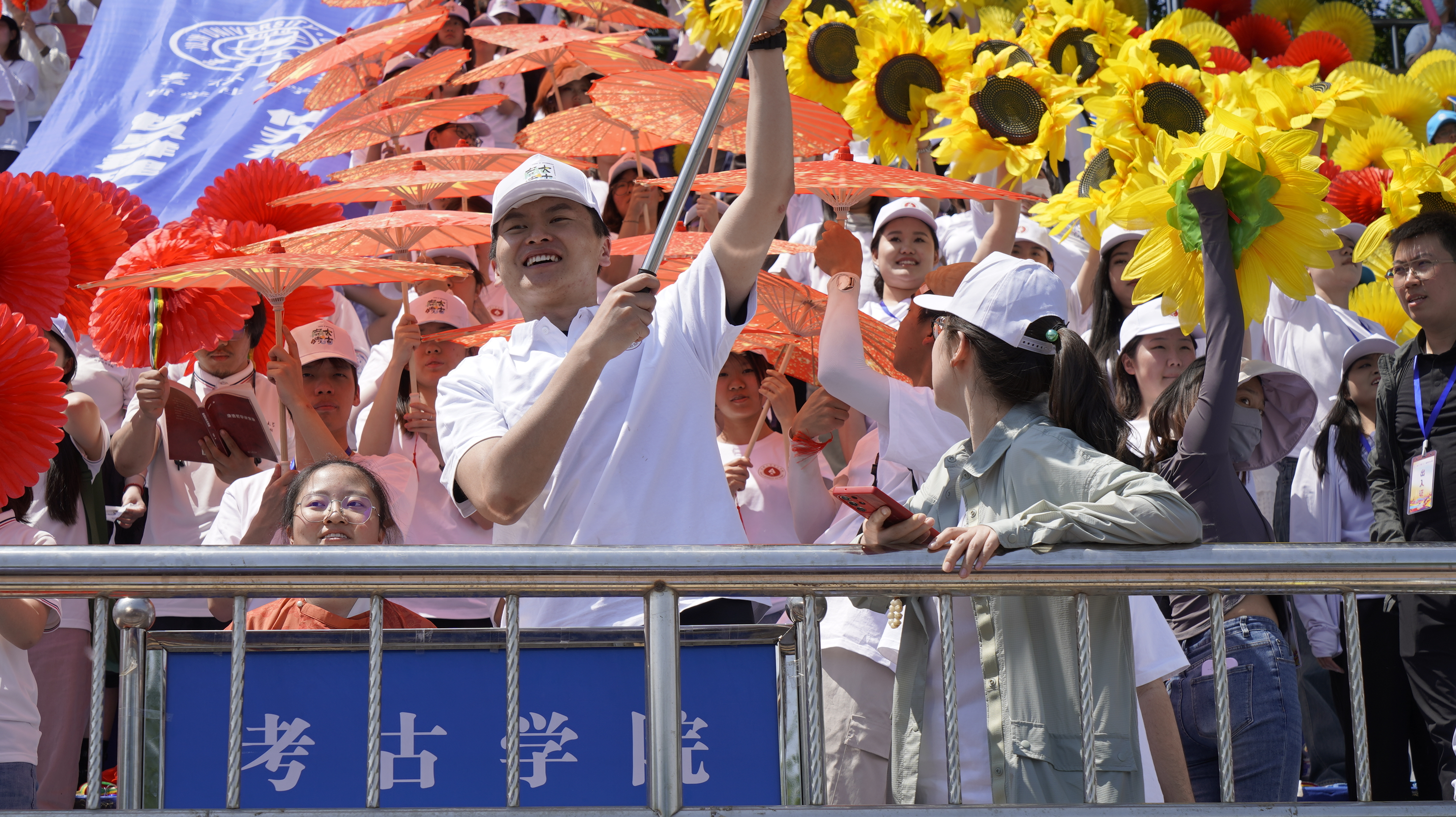 bat365在线平台登录的42名方阵队员迎着旭日,脚踏微风,步履坚定地走向主席台。方阵到达指定位置,队形整齐划一,精准无误。同学们迅速变换队形,两把团扇轻盈地一合一开,画卷缓缓展开;画卷中央,8名队员头戴草帽,身着工地马甲,握持手铲,环绕探方模拟考古发掘;与此同时,油纸伞与纸鸢相继登场,寄托着对中国考古事业繁荣发展的美好祝愿,汉服的多样性更是将中华文化的博大精深充分地展现出来。当汉服表演落下帷幕,模拟发掘两侧的队员纷纷向中央抛出彩带,宛如庆祝的烟花,象征着考古学子对传承发展考古文博事业的决心与期待。