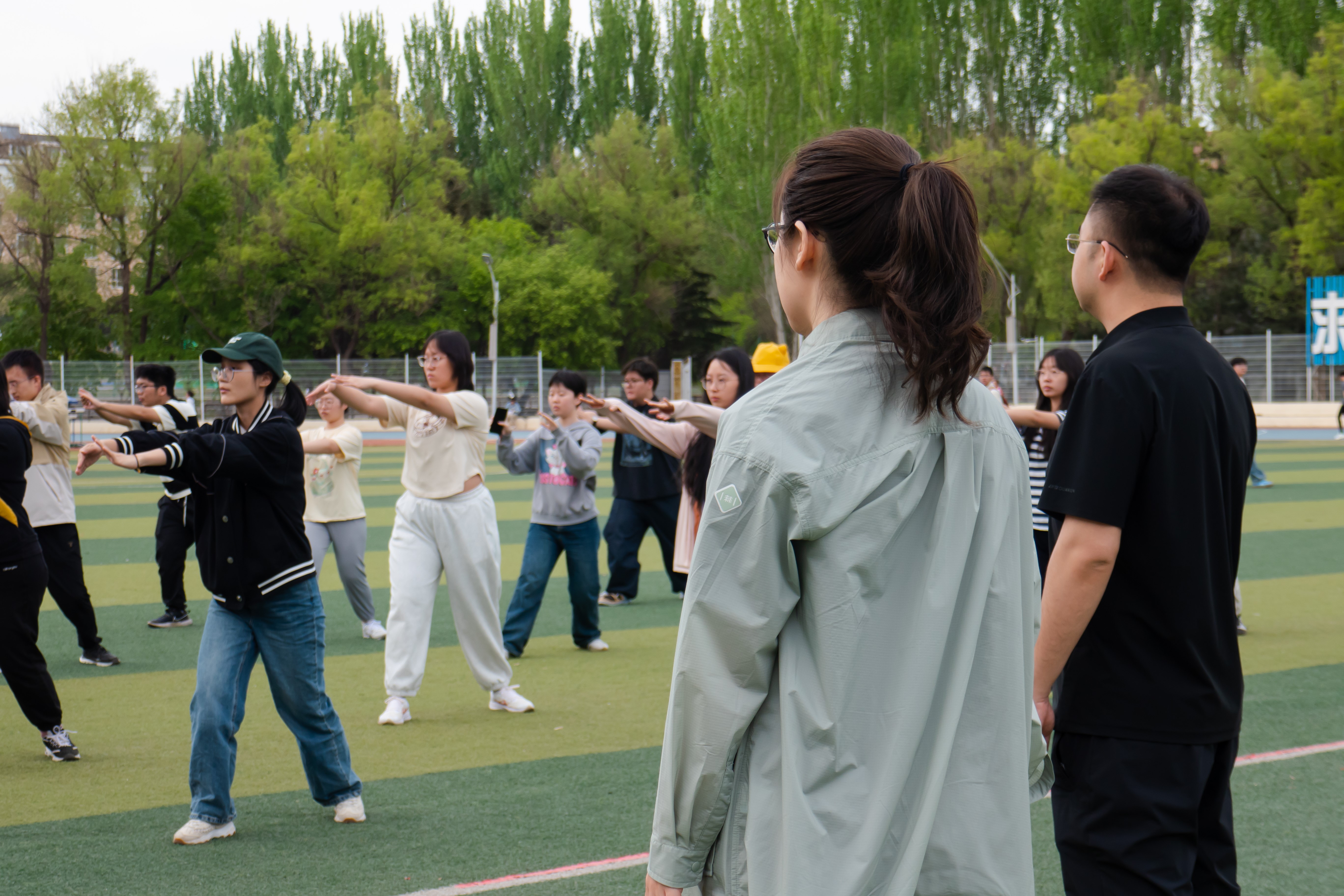 为了让同学们更好地掌握太极拳的动作要领,体会这一武术流派背后所蕴含的丰富文化内涵与深远历史底蕴,在即将到来的校运动会上释放澎湃激情,展现青春活力,bat365在线平台登录自5月7日起开展太极拳集体训练。集训由院学生会主席团成员唐诗雨组织,院团委综合事务部负责人田思昱、文体部负责人王俊超协助,2022级二十余名同学参加。