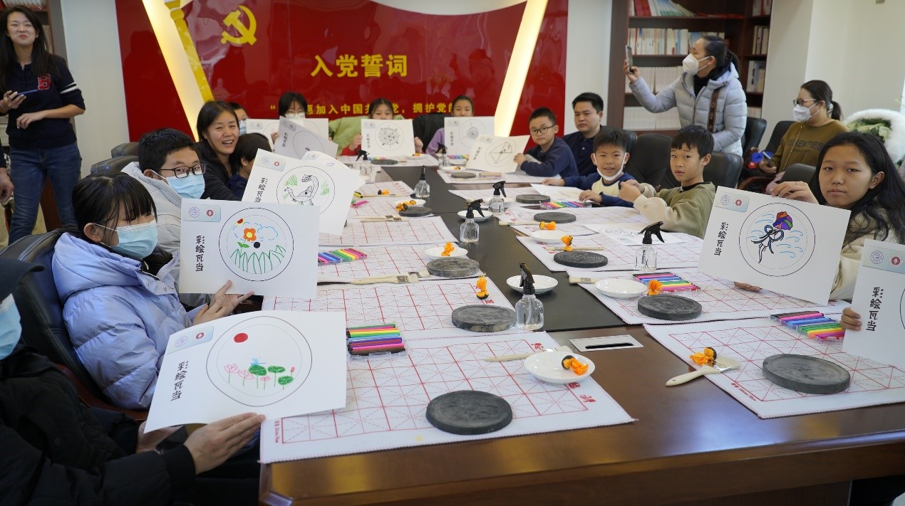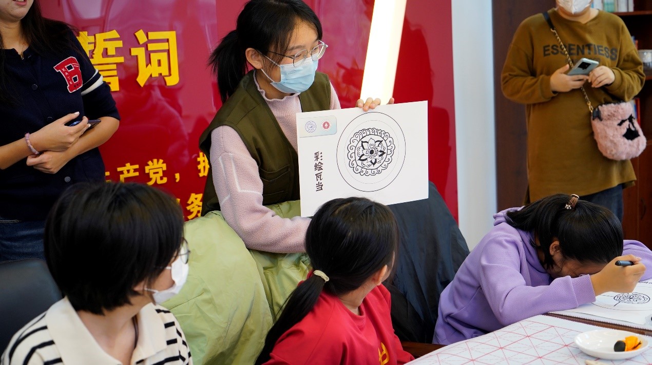 本次活动选取了“瓦当拓印”作为体验重点。活动开始,梁婉莹同学向同学们介绍了瓦当的历史背景和精致的纹饰样式,与同学们共同欣赏中国古代建筑中独特的艺术形式与装饰手法。随后,同学们利用发放的彩绘卡,发挥想象力与创造力,设计出个性化的瓦当图案,创作出一幅幅色彩绚丽的图画。