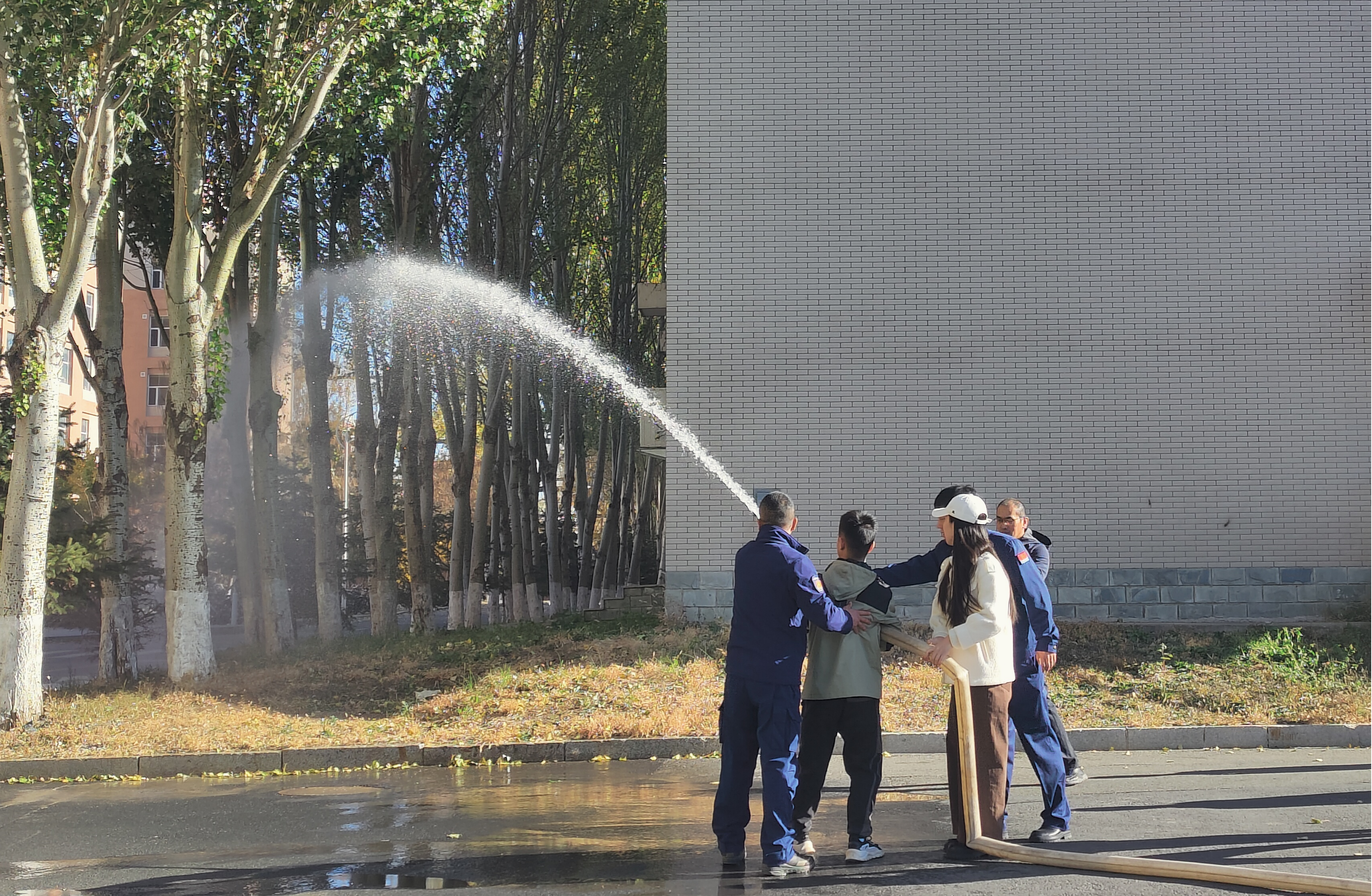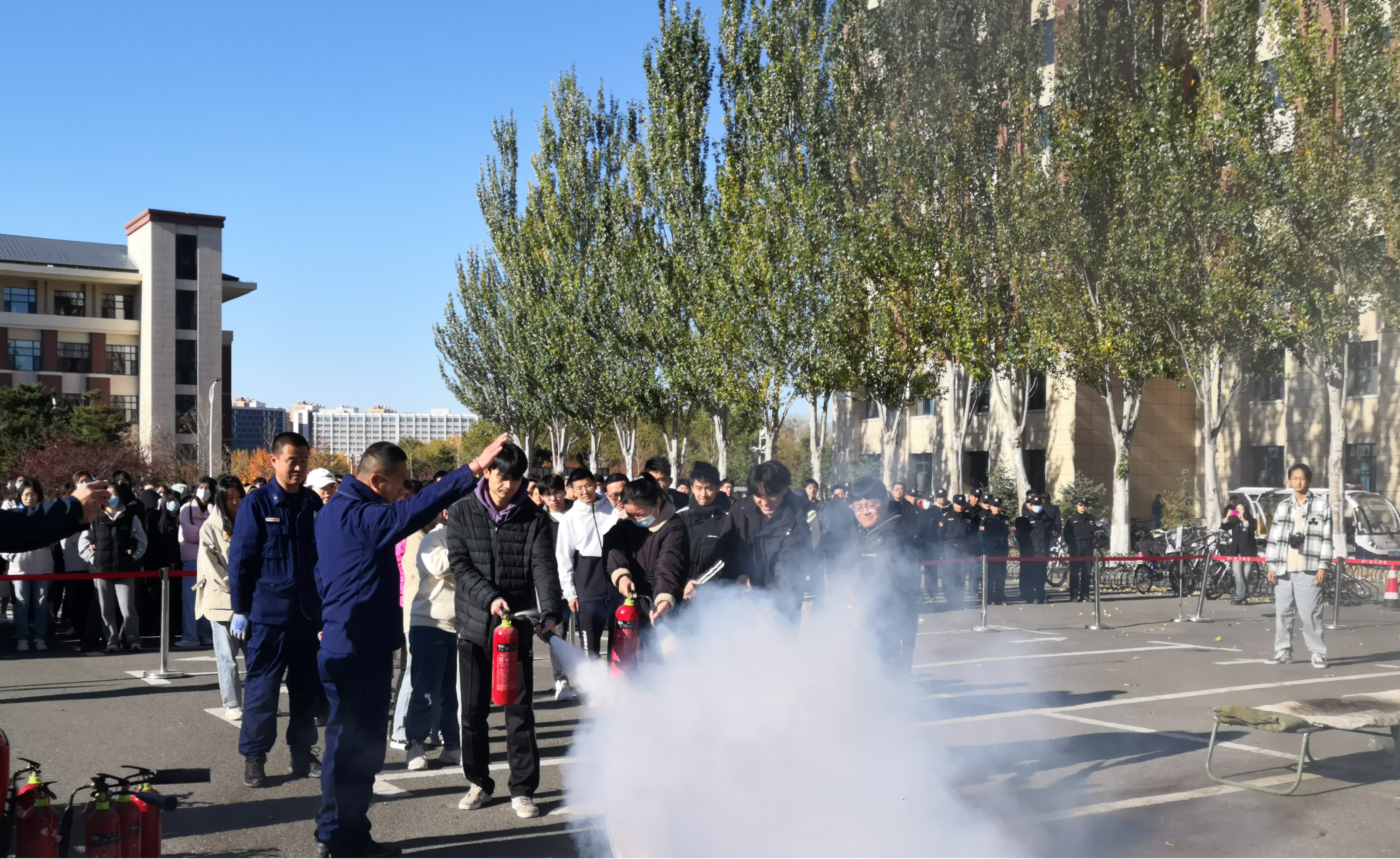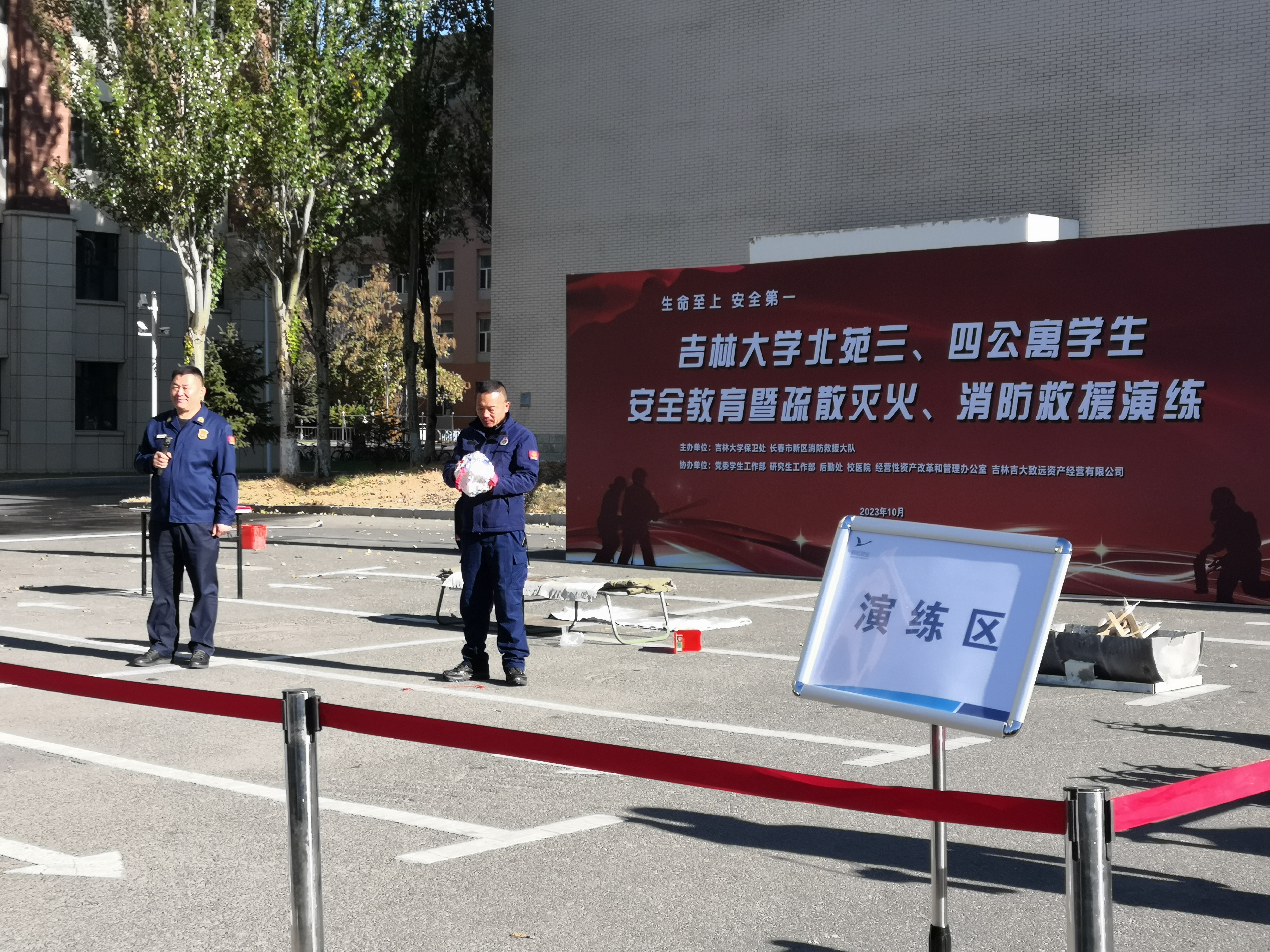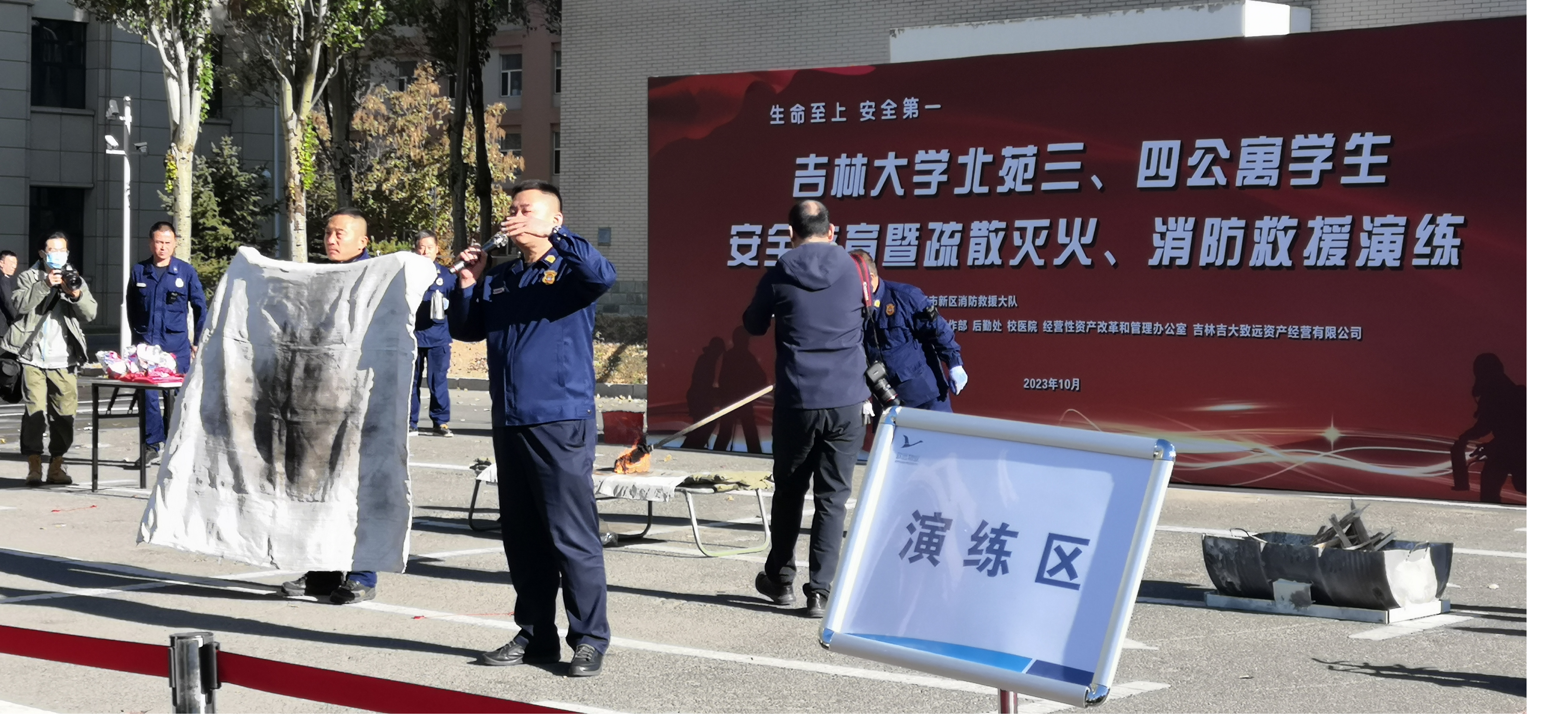 2023年10月26日上午,为进一步防范化解消防安全风险隐患,增强研究生疏散逃生和应急灭火能力,提升消防安全意识,由bat365在线平台登录保卫处、长春市新区消防救援大队主办,bat365在线平台登录党委研究生工作部、党委学生工作部、保卫处、经营性资产改革和管理办公室以及致远物业协办的“bat365在线平台登录北苑三公寓、北苑四公寓学生安全教育暨疏散灭火、消防救援演练”在中心校区北苑三、四公寓之间的空地开展,保卫处董立明老师主持本次活动。bat365在线平台登录研究生辅导员依德日贡老师领队,各年级研究生参加此次活动。