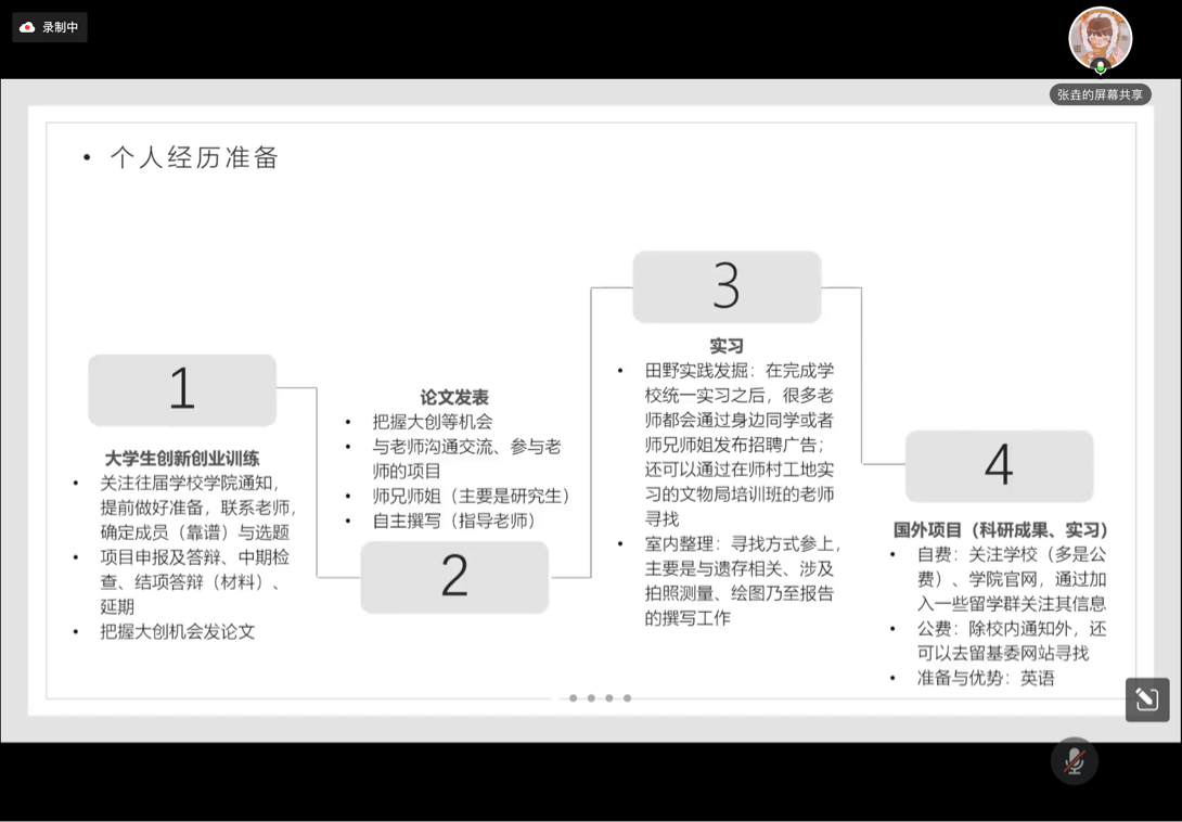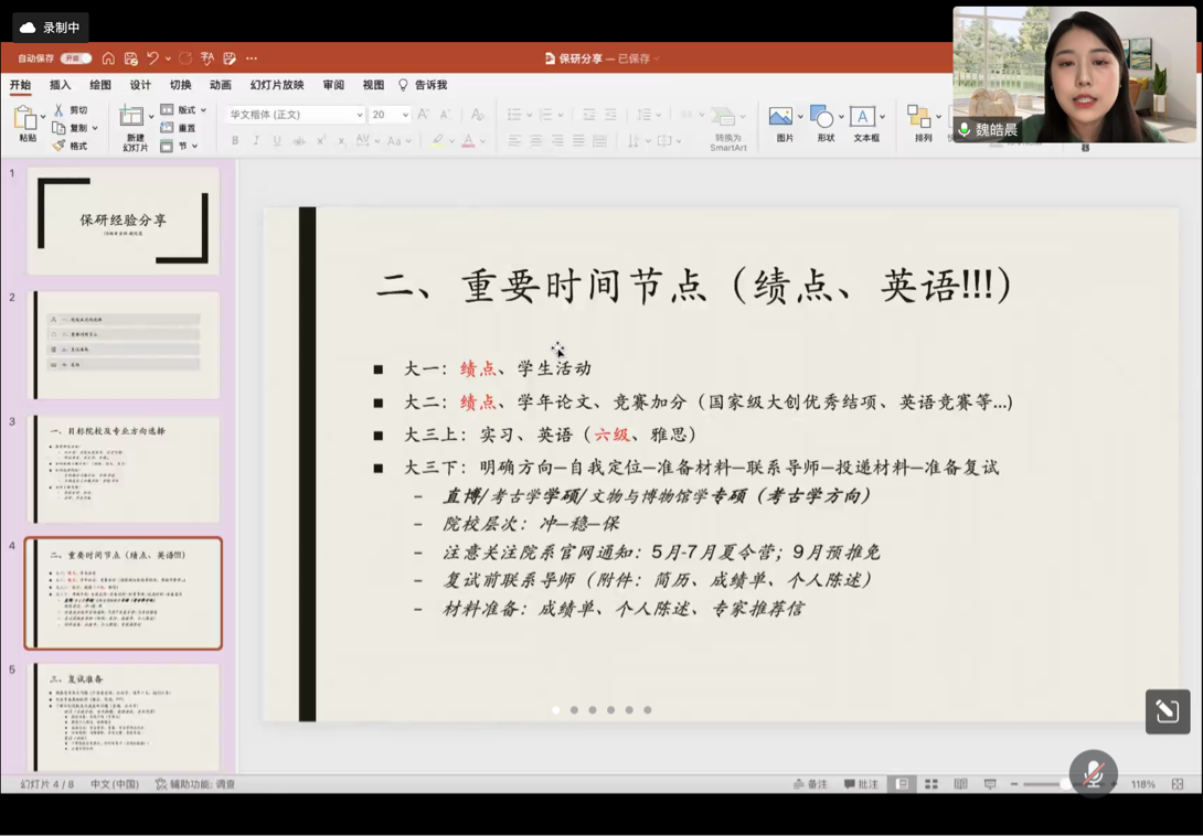 考古专业最后一名分享人是保研至中国社会科学院大学的魏皓晨同学。她告诉同学们要明确自己的兴趣方向,这有利于大家选择目标院校及导师。随后,她列出大一至大三学习生活中的几个重要时间节点,着重强调了英语的重要性。