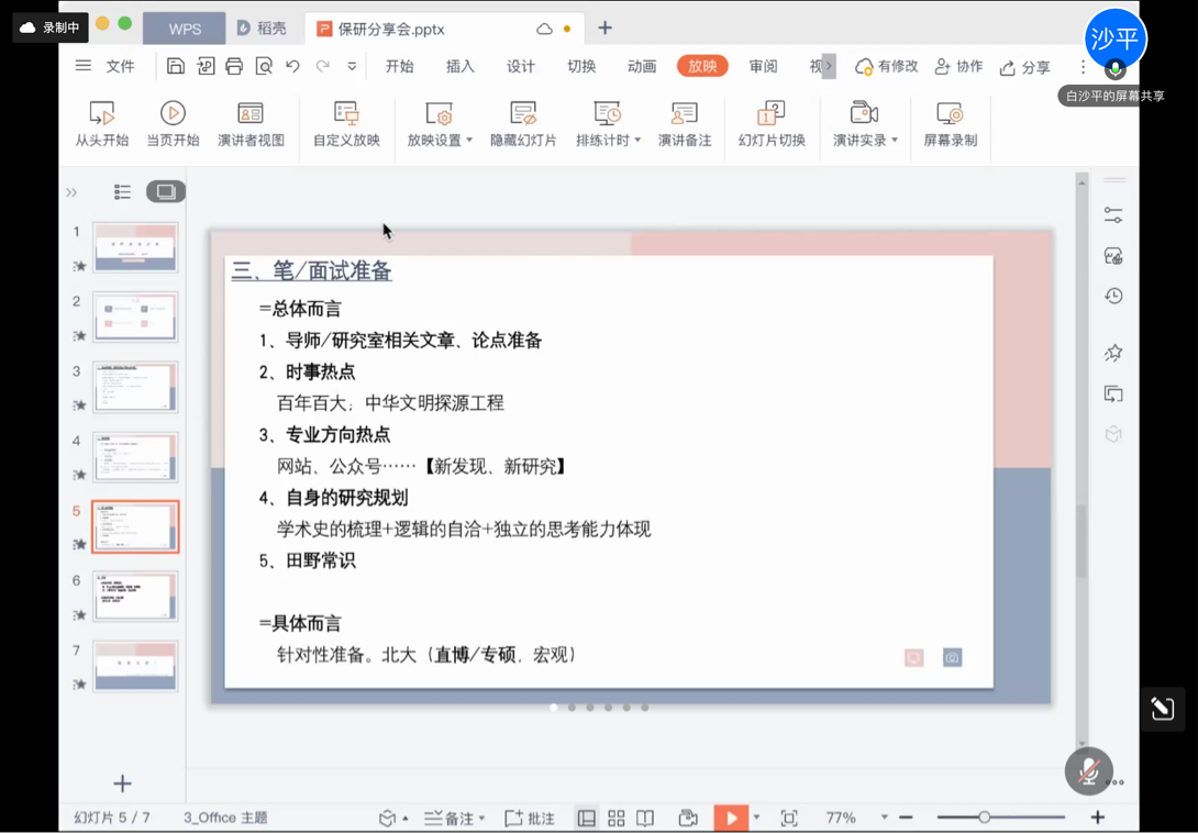白沙平同学为大家带来她保研至北京大学的经验分享。她重点就保送至北京大学的保研前的准备工作以及笔试面试准备进行了回顾。她指出在备考过程中要密切关注近年的“十大考古发现”以及“百年百大”等热点问题。在院校的选择上,白同学提供了传统强势院系、专业方向和导师选择三个关注点,并为大家提供了一些了解信息的重要渠道。