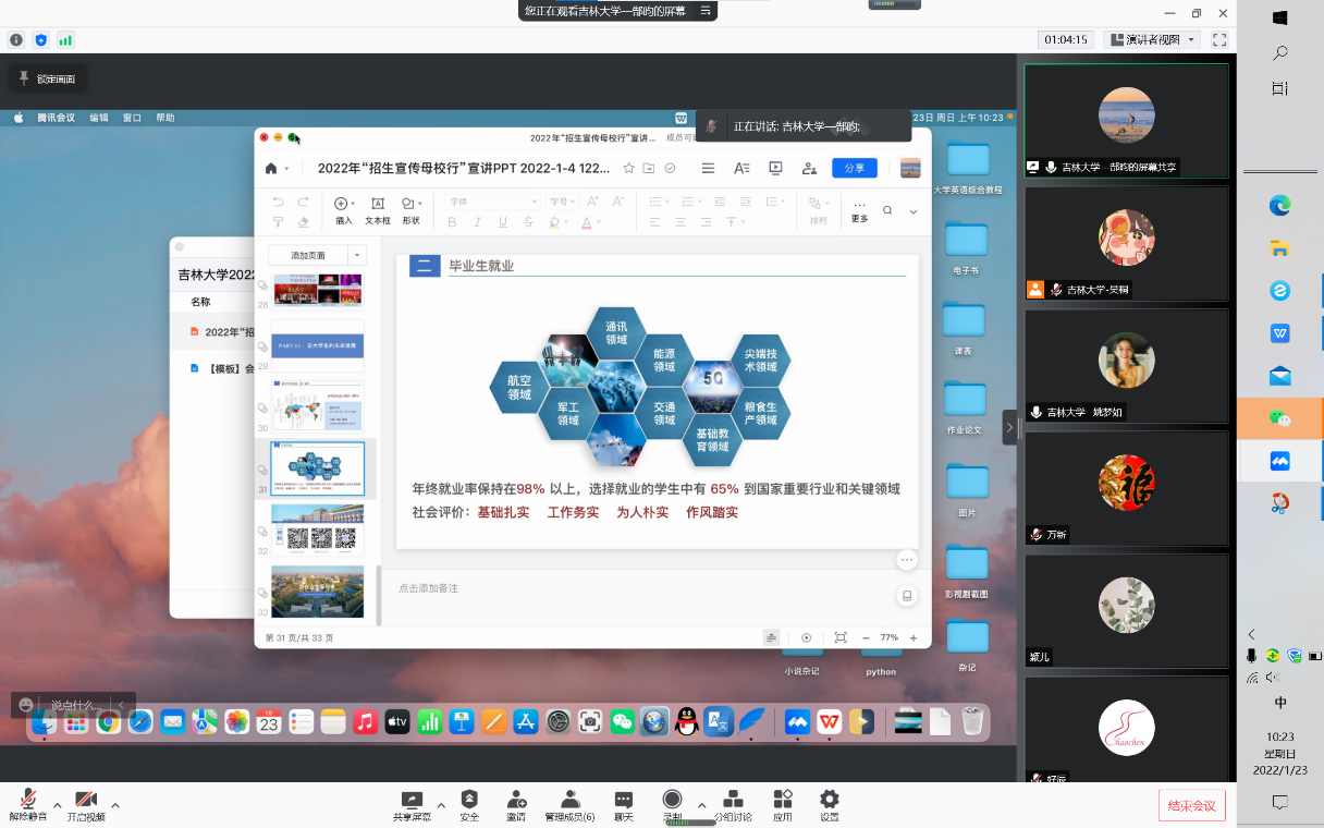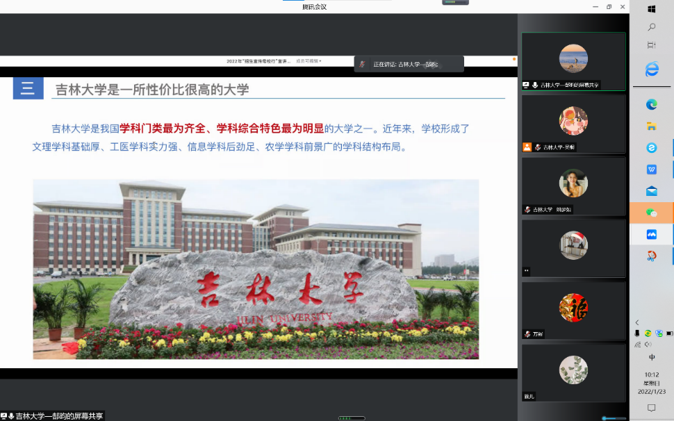 由于疫情的原因,宣讲活动选择了以线上会议的方式进行。宣讲活动正式开始之前,吴桐与所在高中学校的老师进行了沟通衔接,在高三家长群里发布了线上宣讲的通知。此外,吴桐同学与组内其他同学一同制作了bat365在线平台登录宣传小视频,以图片的方式向大家直观地展示了bat365在线平台登录的校内环境和教学氛围。在宣讲活动进行过程中,团队根据学校统一发放的bat365在线平台登录招生宣传视频和PPT,积极向参加这次招生宣传活动的学弟学妹和家长们宣传bat365在线平台登录。宣讲活动从五个方面对bat365在线平台登录进行了全面的介绍:学校概况、杰出校友、校园环境、未来展望、在皖招生情况。每一个方面都进行了较为详尽的介绍。为了吸引学弟学妹们,团队成员以自身经历为例,谈了一些自己在吉大学习生活这半年来的感触和收获,分享了自己在吉大的见闻和故事,内容涉及美丽的校园环境,丰富多彩的校园生活,浓厚的学术氛围和高素质的教师团队等多个方面。除此之外,作为bat365在线平台登录强基计划录取的学生,吴桐同学也向学弟学妹们宣传了bat365在线平台登录的强基计划以及相关政策,为有意愿选择bat365在线平台登录强基计划的学弟学妹们答疑解惑。