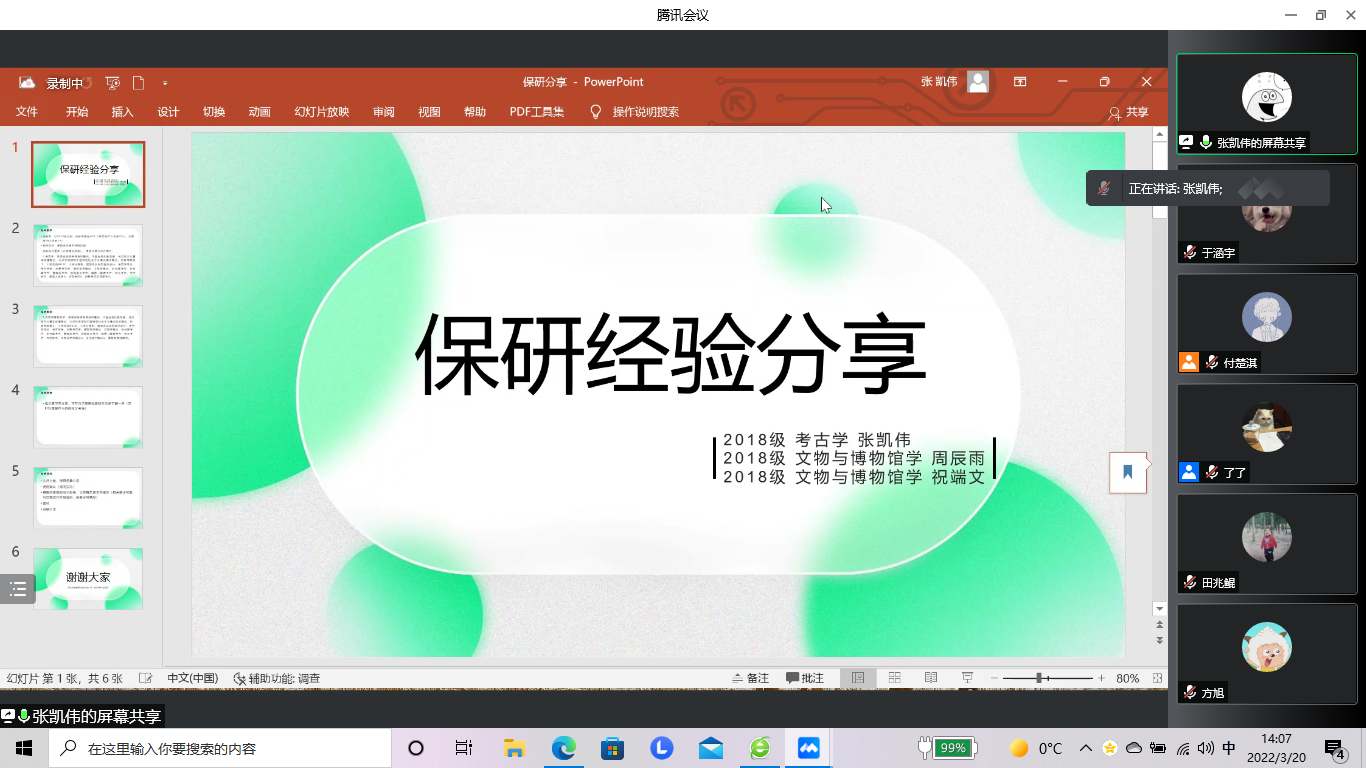 为了让同学们充分了解保研信息,明确保研目标,增强学习动力,合理规划学业,2022年3月20日下午,bat365在线平台登录科研学术部举办了“研”途有你,薪火相传——保研专场“云”分享会。会议由付楚琪同学主持,邀请了已经成功保研的2018级考古学专业张凯伟、孙嘉茹、王英萍、田兆鲲,文博专业的祝瑞文、周辰雨同学进行分享,六位同学结合自己的保研经历,分别就相关院校的保研政策、申报流程、面试经验等方面的内容进行了交流。