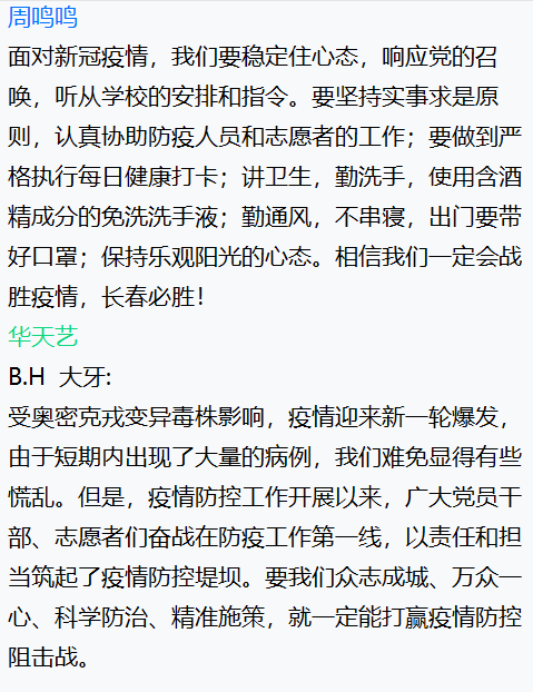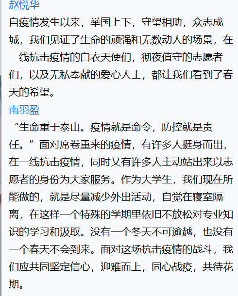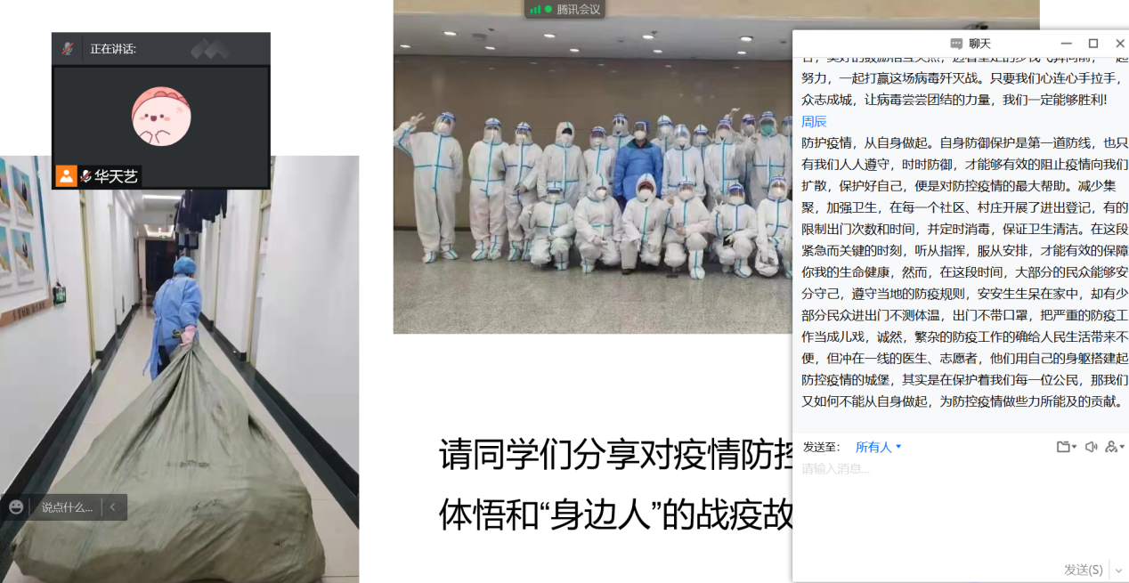 尽管本次班会在疫情中举行,大家只能通过线上的方式交流,但是同学们仍然积极、主动参会,并且通过网络会议表达了对一线抗疫人员的敬佩、对抗击疫情必胜的信心,充分展现了青年学子的责任与担当意识。相信只要我们携手抗疫,同舟共济,一定会战胜疫情!