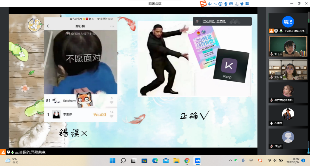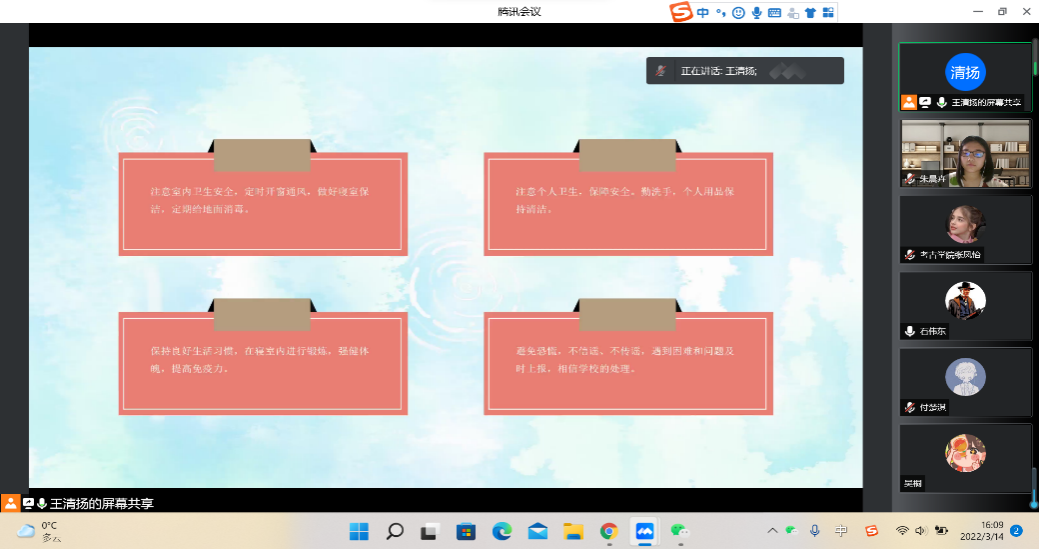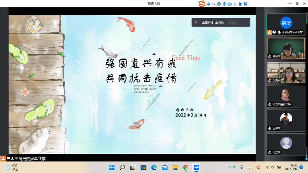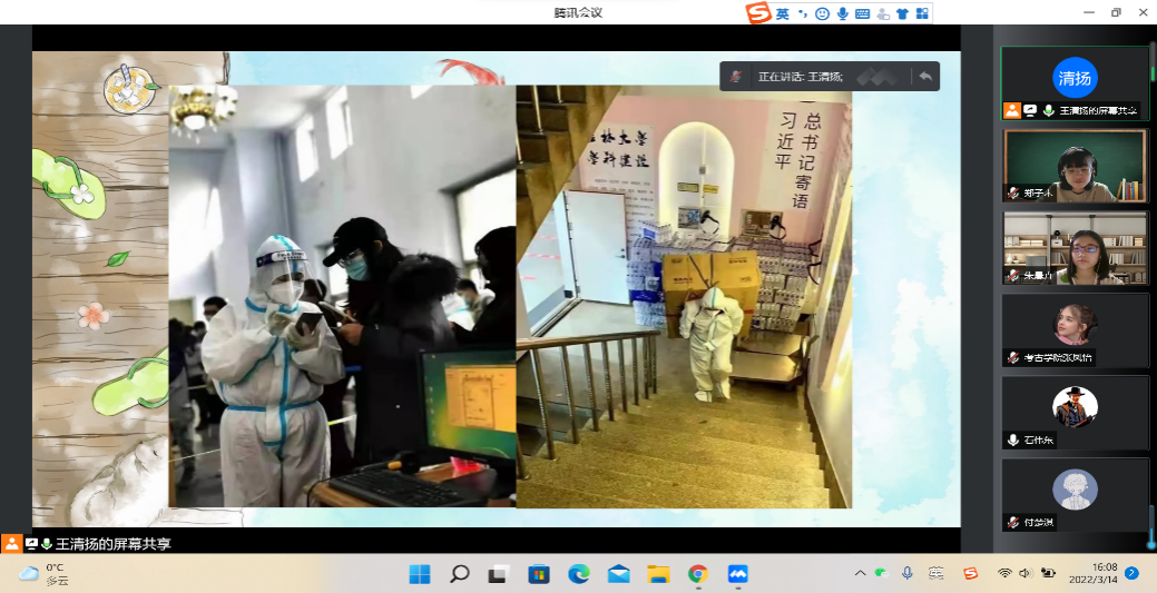 3月14日下午,按照学院防疫工作部署,bat365在线平台登录2021级古文字班于线上组织开展了疫情防控导学主题班会。会议由班长王清扬同学主持。
