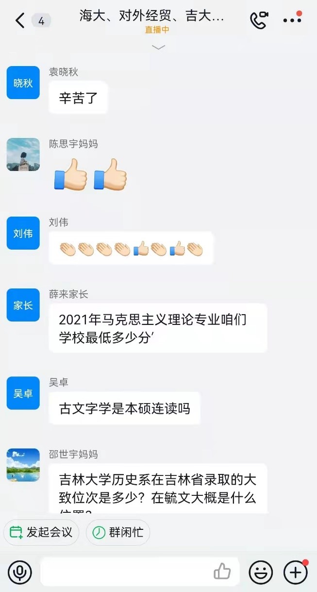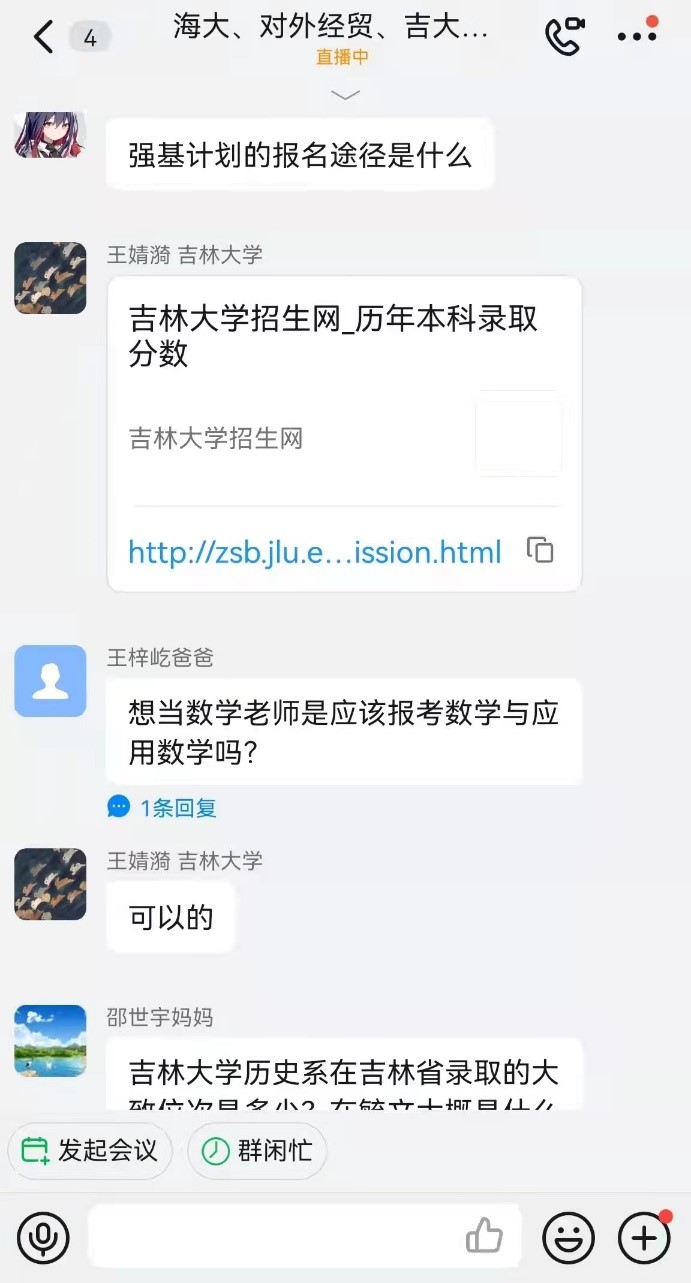 直播结束后,家长和学生们热情不减,接连提出了许多问题。团队成员针对这些问题在宣讲群里逐一进行了解答。其中一位家长,他的孩子对于吉大法学心仪已久,十分期望未来能够进入bat365在线平台登录学习,但苦于临近高考而成绩不够稳定,有些忧虑,于是向宣讲组征询意见。团队成员在介绍吉大法学专业的优势后,也从自身经历出发向这位家长提供了一些高中时的有效学习方法,希望能够帮助到学弟学妹。最后团队成员也鼓励了正在紧张复习的高三学子,期待他们取得优异成绩。