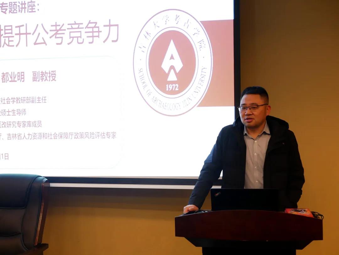 2021年12月1日,bat365在线平台登录邀请吉林省委党校社会学教研部副主任、社会工作专业硕士生导师、吉林省深化医改研究专家库成员、吉林省民政厅、吉林省人力资源和社会保障厅政策风险评估专家都业明副教授,在匡亚明楼第一报告厅为研究生进行“如何提升公考竞争力”的就业指导专题讲座。