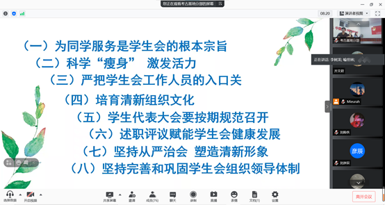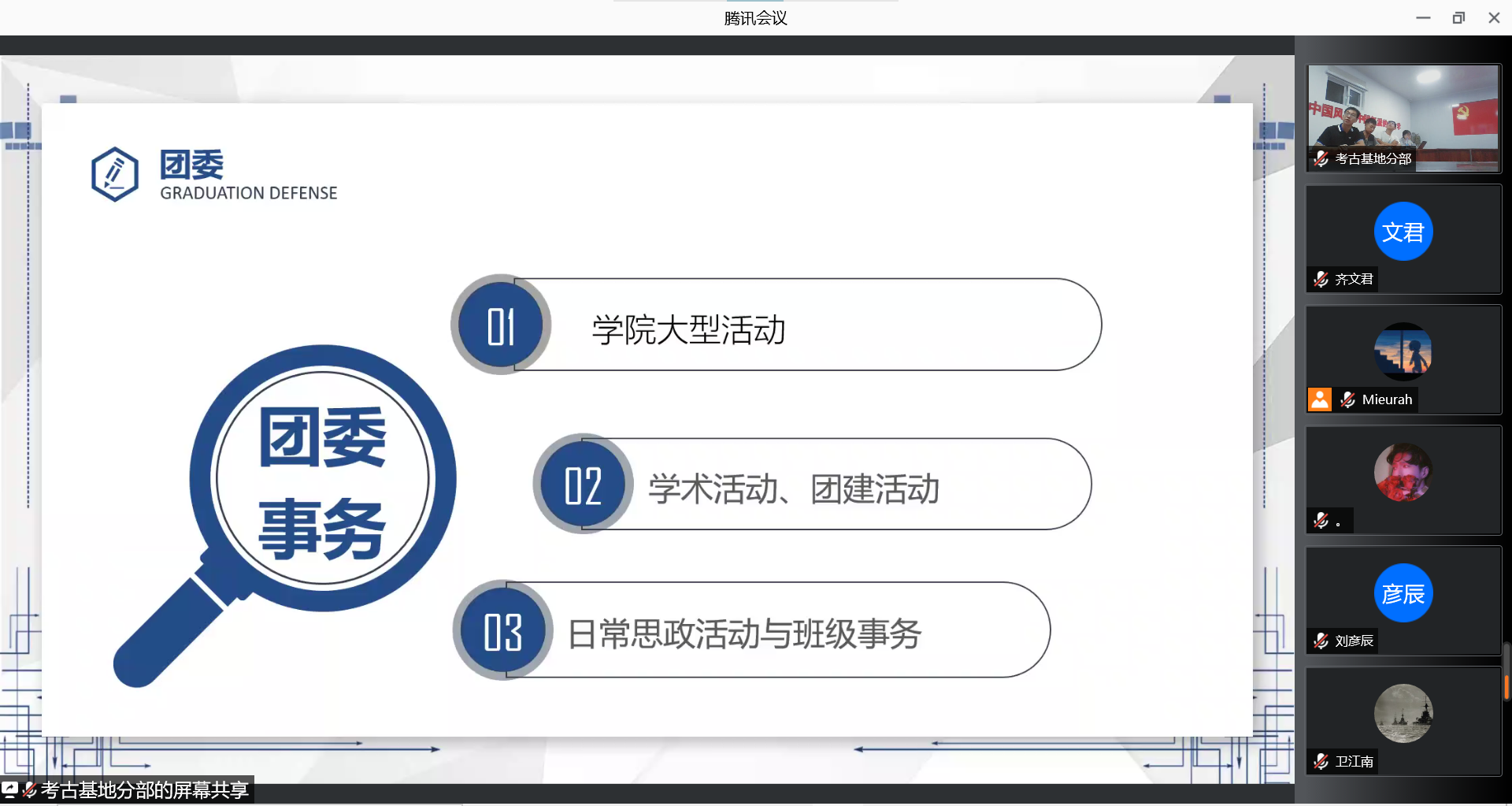 会议伊始,团委副书记温景超同学向新生同学们介绍了团委的总体情况,并用生动的PPT展示了历届团委所举办的各项学生活动。之后,团委各部门负责人同学依次介绍了团委办公室、团委实践部、团委组织部、团委宣传部通讯中心和新媒体中心的工作概况,其精彩的发言充分调动了同学们的情绪,宣讲会的气氛逐渐活跃起来。在团务常委王克豪同学的风趣小结后,团委各部门的宣讲进入尾声。随后,学生会主席团成员李广泽同学向大家介绍了学生会的基本情况与服务宗旨,并重点阐述了bat365在线平台登录的学生会改革与作风建设问题,强调“为同学服务”是学生会的根本宗旨,要坚持从严治会、科学“瘦身”、激发活力,塑造清新阳光的学生组织形象。在简要概括了学生会的发展方向后,学生会各部门负责人也依次介绍了综合事务部、科研学术部、校园文化部与心理健康部的工作概况。通过各位师兄师姐们的讲述,新生同学们对bat365在线平台登录团学组织有了较为充分的认识。在全体部门的宣讲结束之后,自由提问与答疑环节将本次宣讲会的热烈气氛推向新的高潮。最后,主持人张馨予同学向新生同学们宣布了正式纳新面试的相关信息。晚上8点30分,在庆祝国庆节到来,祝福祖国繁荣昌盛的欢呼声中,本次团学组织线上宣讲会议圆满结束!