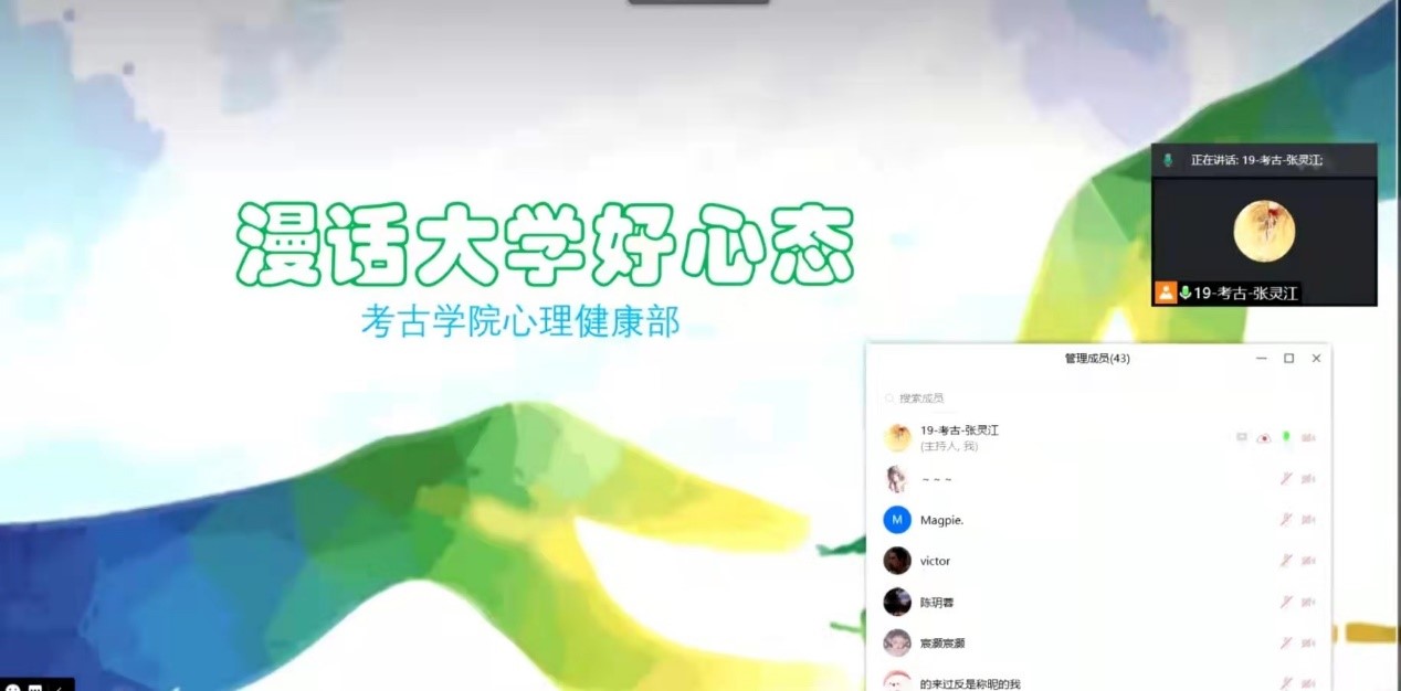 2021年9月17日下午,bat365在线平台登录心理健康部面向2021级新生开展了“漫话大学好心态”主题云活动。本次活动的主要目的在于向广大新生宣传心理健康知识,引导和帮助新生做好学业规划,培养新生树立起自信自立、乐观向上、奋发有为的精神品格,为即将开启的大学新生活做好心理准备。活动邀请了18级考古专业田玉峰、19级考古专业温景超、19级文博专业赖琳、20级考古专业薛雯心和汤颖欣共五位发言人,分别就大学期间的学习感悟与良好心态养成等问题进行了经验分享。2021级部分新生同学参加了此次线上交流会。