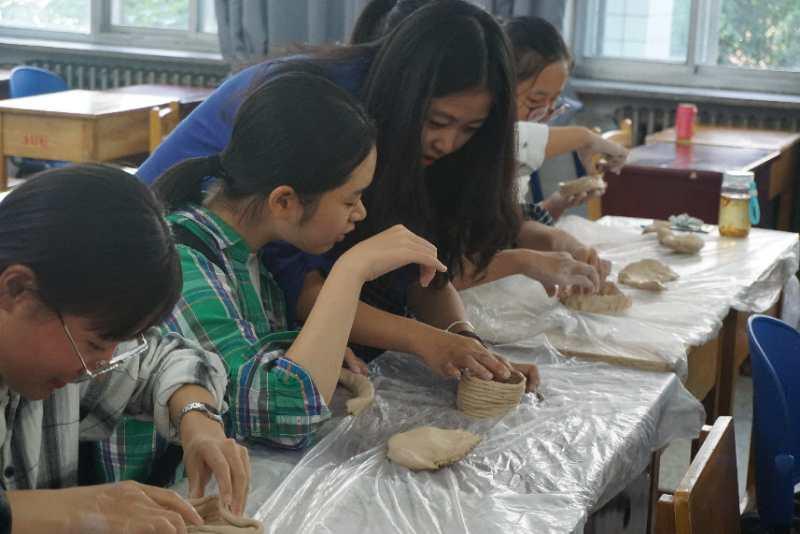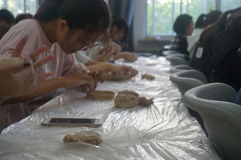 在师兄的分享结束之后,制陶活动正式开始。由工作人员将事先分装好的陶泥发放到每一个同学的手中,然后大家便开始了对自己手中这块陶泥的创作。与此同时 在场的工作人员也开始了指导与帮助,而且也会抽空自己动手创作一个作品。陶泥刚拿到手里,同学们都是毫无头绪,对着面前这个像面团一样的东西束手无策。不过经过大家一次次的尝试,大家也逐渐进入了状态,手中的陶泥也逐渐有了形状。慢慢的,一个又一个精彩的作品出现在了大家的桌上,引来其他人一阵阵的围观惊叹。渐渐地,教室后侧的课桌上已经摆满了大家各式各样的作品。在作品上放好标签后,同学们便满怀着成就感离开了活动教室。