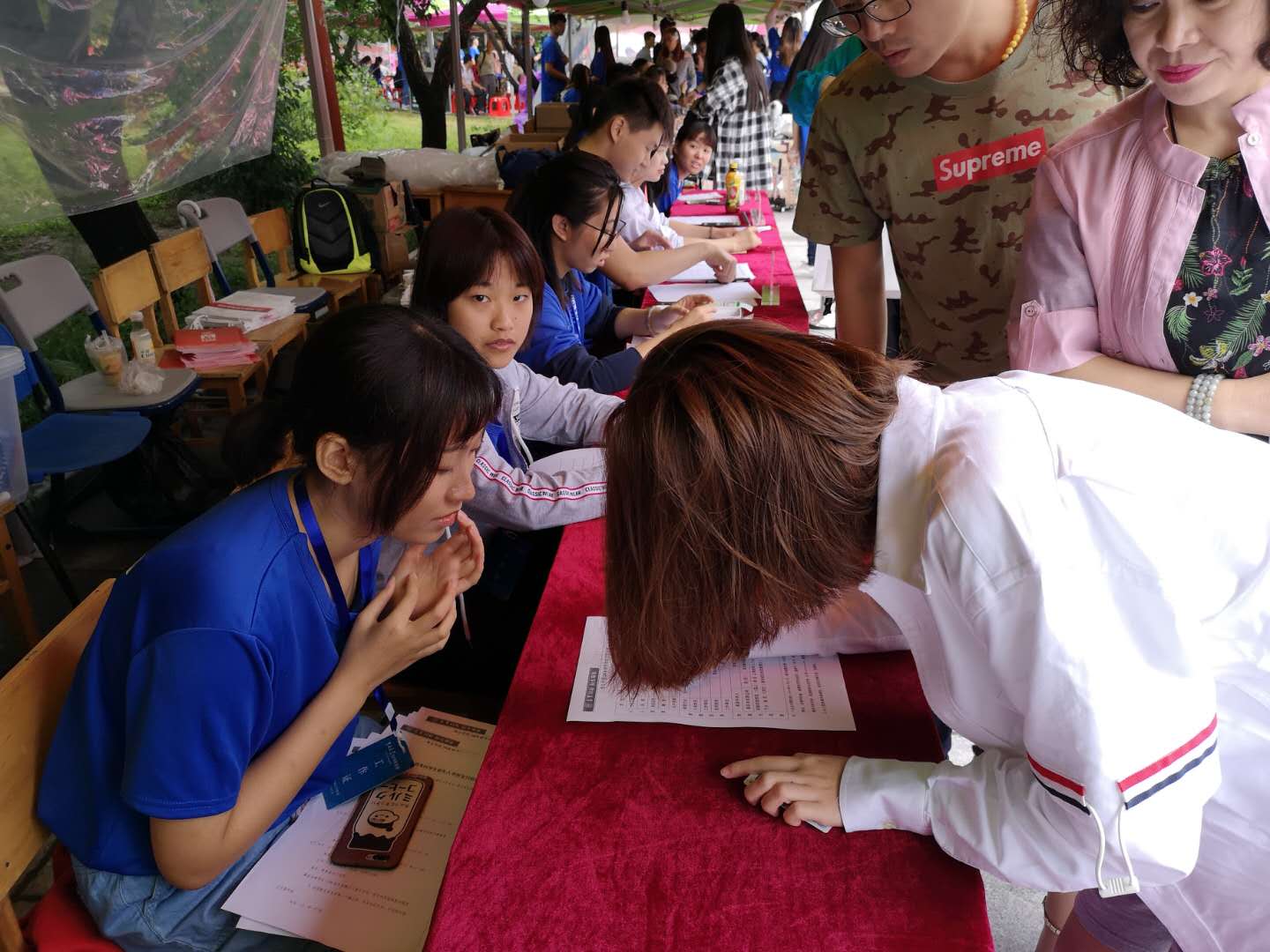 下午一点,新生们陆续至迎新现场报道,辅导员助理详细解答新生问题,帮助新生办理报到手续并引导新生至签到墙上签名并与“田田”合影留念。大本营外,朋辈志愿者们也陆续与自己对接的新生见面。报到前多日的线上联系早已让他们充分了解彼此,在一对一朋辈志愿者的引领下,新生们有序整理行囊,参观校园,迅速了解学院学科特色、学院工作章程等情况。