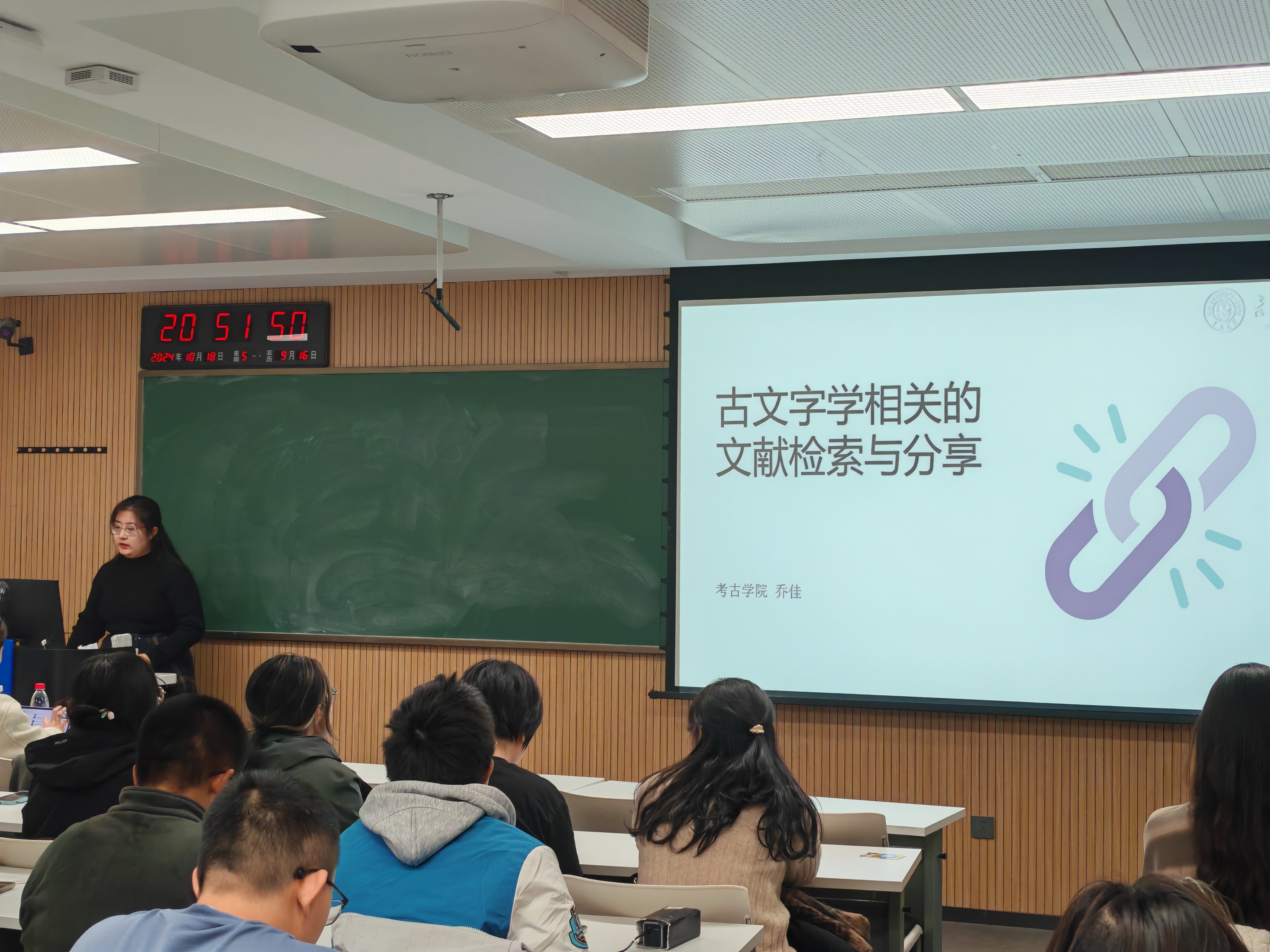 最后,古文字专业的乔佳同学以古文字类文献的分类为线索,分录著类、字编类、读本类、通论类、研究性书籍及相关期刊进行了详细的文献推。同时,结合古文字学学科与科技融合的发展方向,乔佳同学对古文字学习研究常用的网站与小程序进行了分享,并带领大家现场实操使用了部分网站与小程序。最后,她鼓励大家积极利用人工智能等现代科技助力古文字学研究学习。